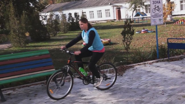 Уверено и с задором девочка ездит на велосипеде, преодолевая различные препятствия на дорожках возле интерната. И именно в неформальной обстановке девочка наиболее расслабленна и раскрепощена.
