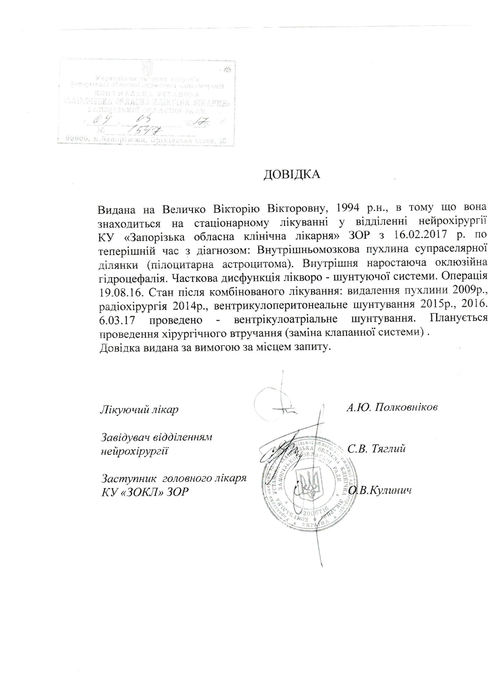 В начале марта ей сделали операцию по перестановке дистального шунта из брюшины в сердечную вену на шее. (только стоимость самого шунта – 6 820 грн ). Но это не улучшило ситуацию, наоборот Вике стало хуже, врачи пришли к выводу, что перестал работать клапан самого шунта, который находится в голове. Операцию нужно проводить срочно, а стоимость клапана 16 275 грн. Для одинокой мамы, воспитывающей двоих дочерей это просто фантастическая сумма. И все сбережения ушли на поддерживающую терапию: день в реанимации обходиться от 500 грн.