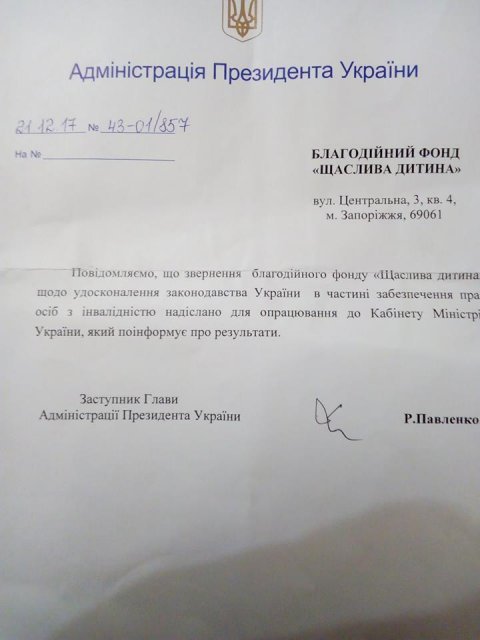 Ура! Судя по всему, наши обращения к Президенту Украины о правах детей-сирот с инвалидностью были услышаны: 12 января 2018 вышел указ Президента №5/2018, согласно которому Кабинету Министров поручено разработать законодательные изменения, позволяющие сиротам с инвалидностью находиться в приемных семьях и детских домах семейного типа до 23 лет! Теперь нужно надеяться на то, что такие изменения действительно будут приняты.