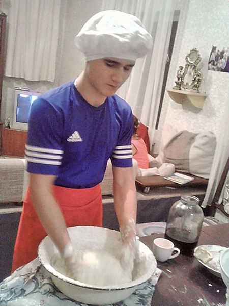 *Пятнадцатилетний Витя замешивает тесто для пирожков. Парень говорит, что пекарское дело — ему по душе