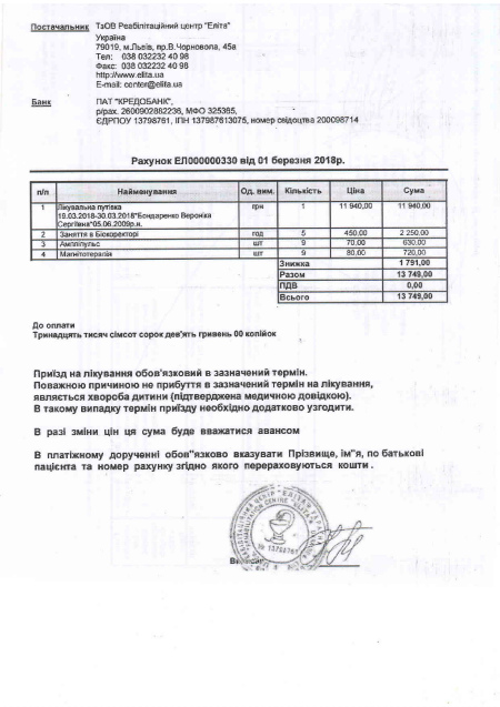 За 8 лет своей жизни малышка прошла множество курсов реабилитации в Донецком центре Евтушенко, клинике профессора Козявкина в Трускавце, курсы интенсивной реабилитации в Харькове и Николаеве, иглоукалывание, ЛФК, 7 курсов препарата Цереброкурин, иппо - и дельфинотерапию.