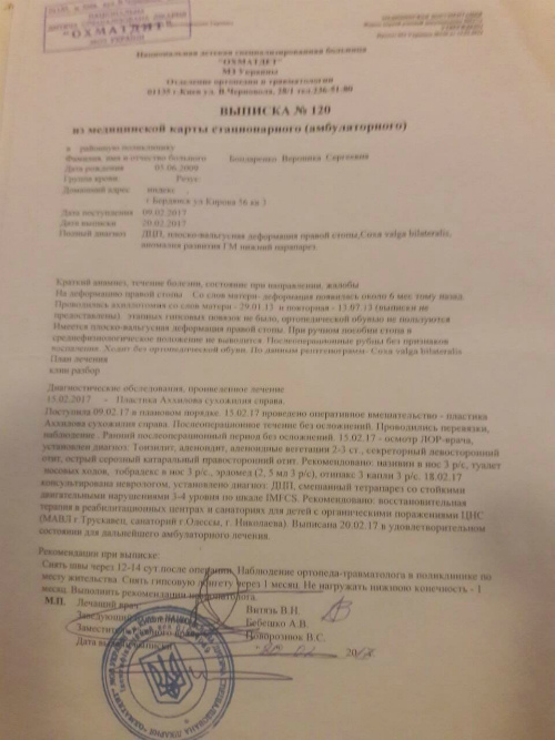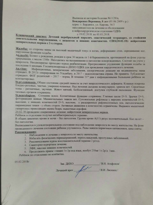 Нике сделали 2 операции по методу Ульзибата (подрезка мышц на ножках), прооперировали в "Охмадете" в Киеве (пластика ахиллова сухожилия), операция в Днепре - нейротомия запирательных нервов.
