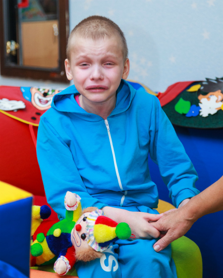 Вот и Игорь встретил съемочную группу испуганными глазами и потоком горьких слез. Он долго не мог успокоиться и все не отпускал руки воспитательницы. Оказывается, мальчик панически боится фотокамер, незнакомых людей и непривычной обстановки.