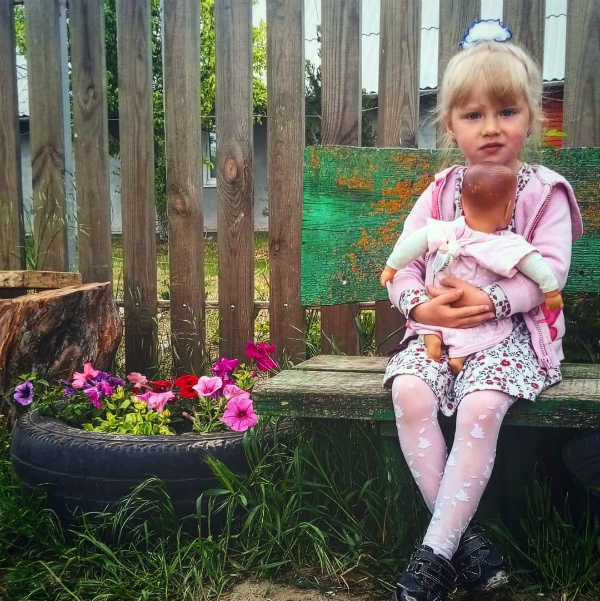 Крошечная красотка в цветочках прижимает к себе куколку, рядом с ней её родные брат и сестра. Дома ласковая мама готовит вкусный завтрак.
