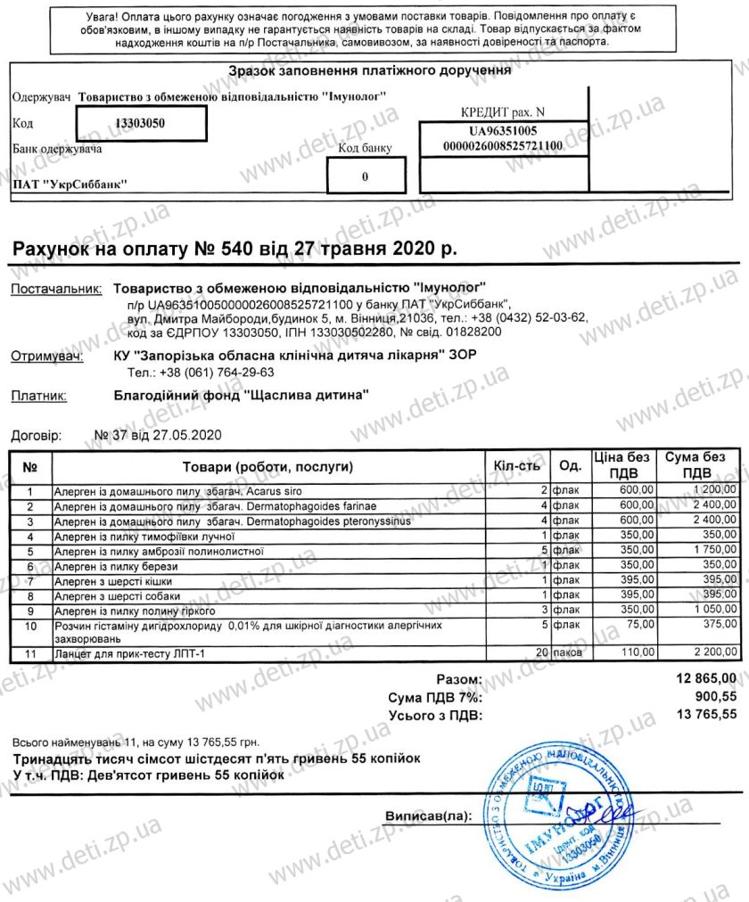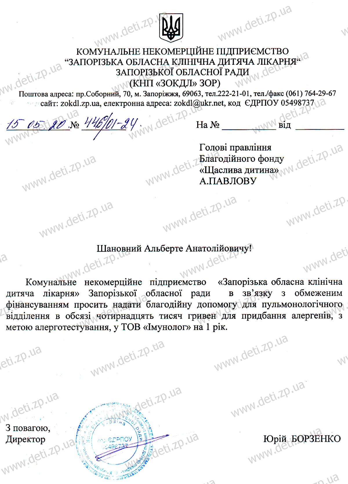 Своевременность и полнота тестирования, индивидуальный подход к терапии - залог отличных результатов в лечении детей. К сожалению, в Запорожской областной клинической детской больнице сегодня нет реактивов для диагностики типа аллергий. Представьте, что даже самый опытный врач не может обнаружить, от чего именно задыхается ваш ребенок. Не может выявить и помочь! Для полного и своевременного диагностирования детей нужны реактивы, стоимость которых составляет 14000 гривен в год.