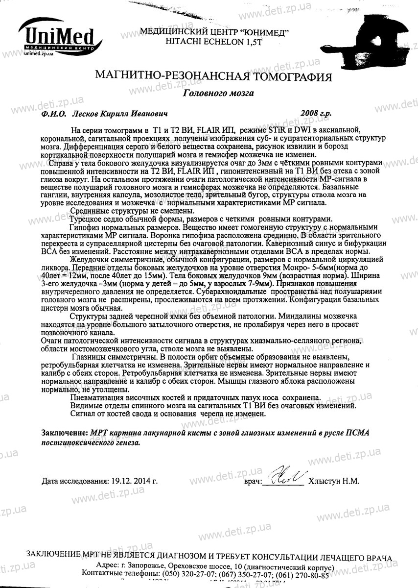 С ноября у Кирюши начались приступы с торможением речи и с нарушением координации движения. Обследование МРТ показало, что у ребенка киста головного мозга (справа), начались приступы эпилепсии. Теперь дополнительно назначен новый препарат от приступов. Кирюшу ожидают еще операции по восстановлению мочеиспускательной системы. Все эти годы он не может обходиться без памперсов. Назначение медикаментов часто меняется, в зависимости от его состояния.