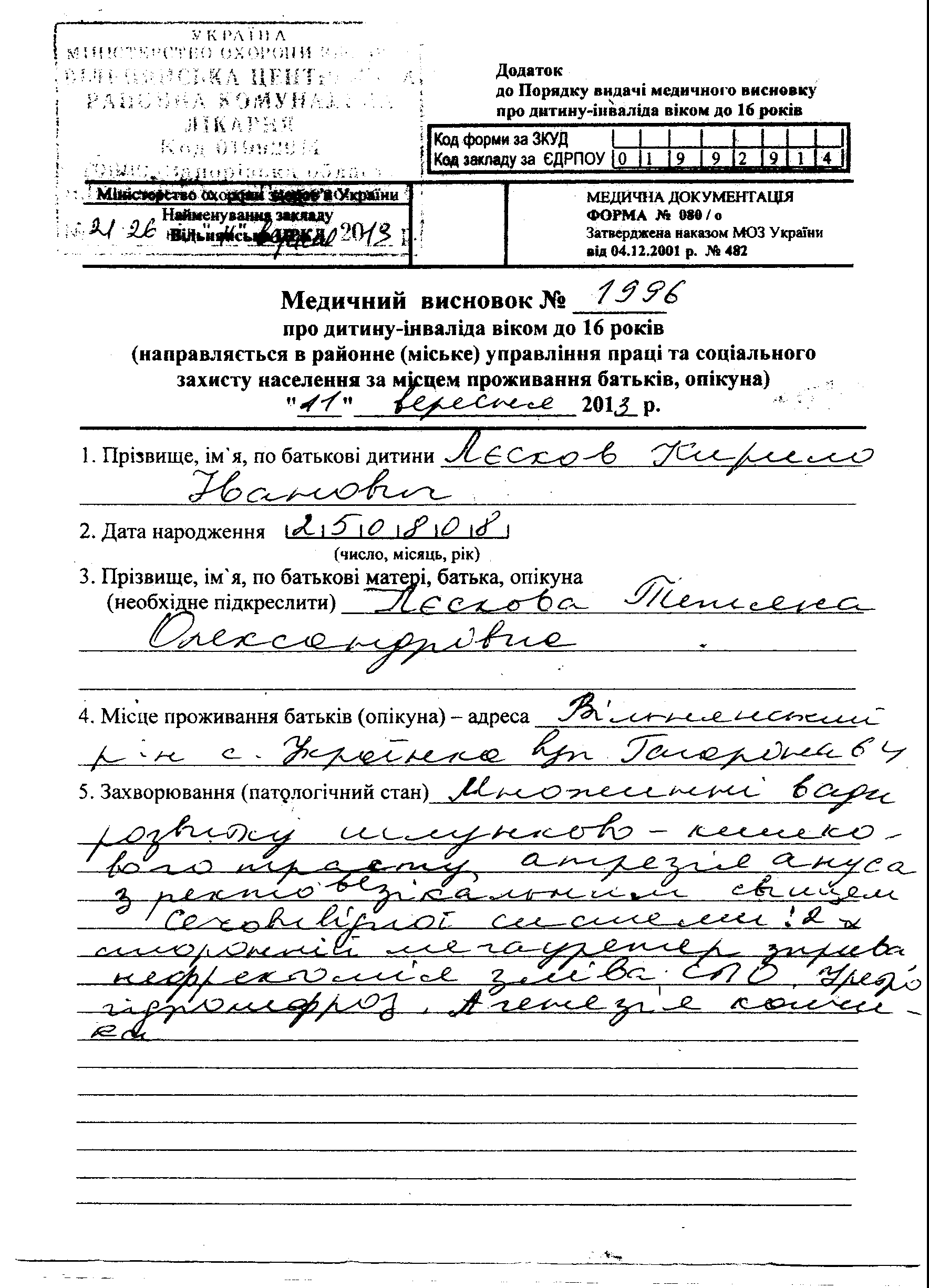 Диагноз: Множественные врожденные пороки развития: атрезия (отсутствие) ануса и прямой кишки, порок развития мочевой системы; двусторонний гидронефроз; повреждение центральной нервной системы.