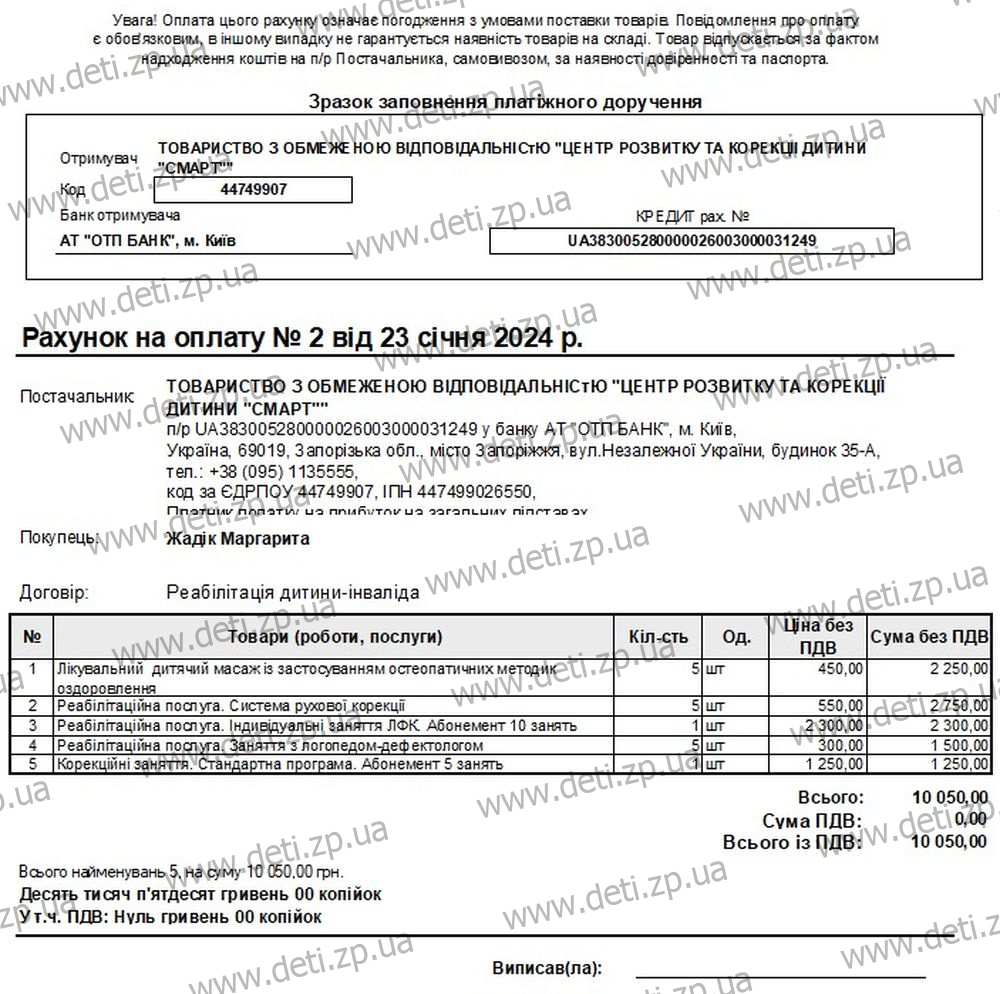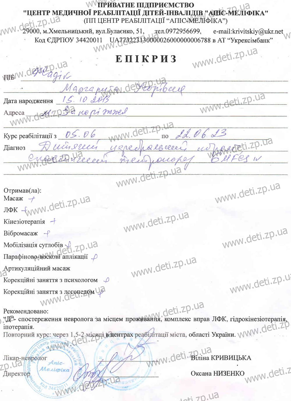 Margarita is scheduled for therapy at the Sovenya Neurocorrection, Rehabilitation, and Development Center in Zaporizhzhia in June 2025. The planned treatment includes therapeutic massage, motor correction, physical therapy, speech therapy, and corrective sessions to help Margarita take her first steps. The cost of this course is 10,050 UAH (approximately $260 USD).