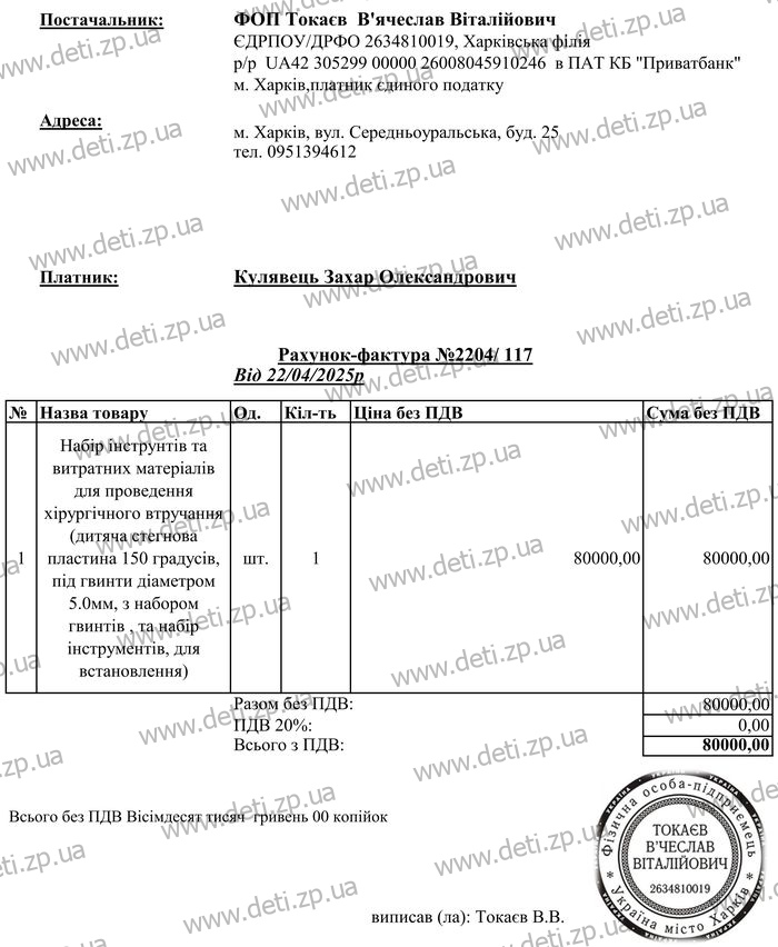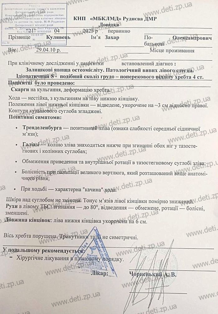 Doctors stress the urgency: Zakhary needs immediate surgery to correct the dislocated hip, followed by a lengthy rehabilitation process. The operation is scheduled to take place in Dnipro, at Rudnev Hospital. While the surgery itself is free of charge, the medical instruments and consumable materials required for the procedure cost 80,000 UAH (approximately 1940 USD) — a sum the family simply cannot afford.