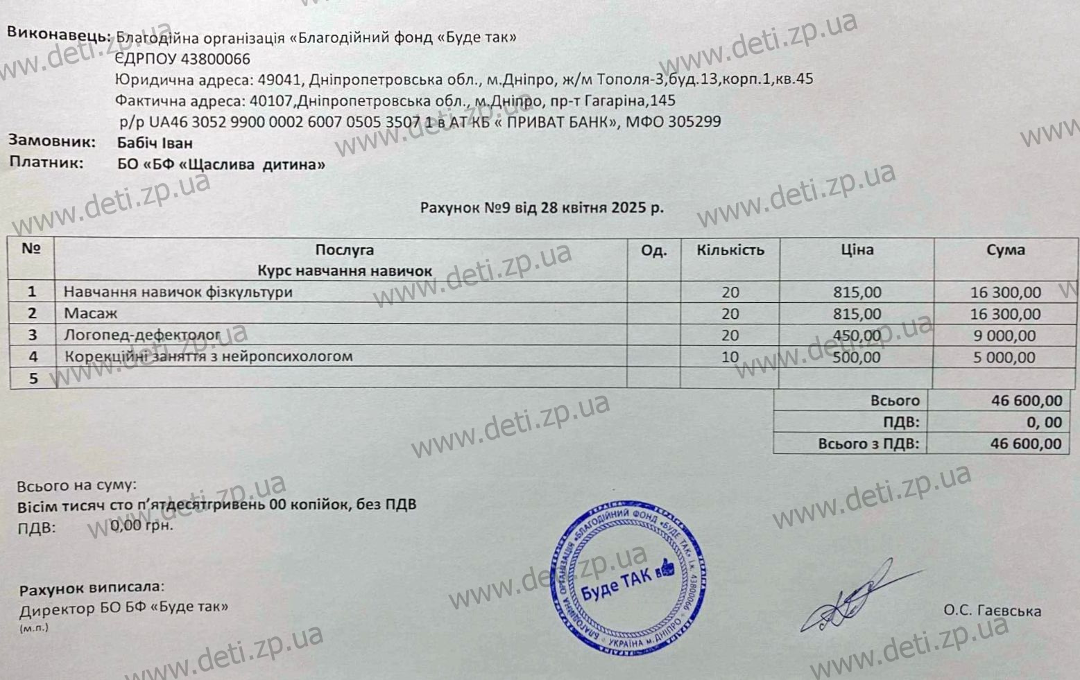 Навчання навичок фізичної фізкультури №20, масаж №20, логопед-дефектолог №20, корекційні заняття з нейропсихологом №10 (часткова оплата, остаточний розрахунок)