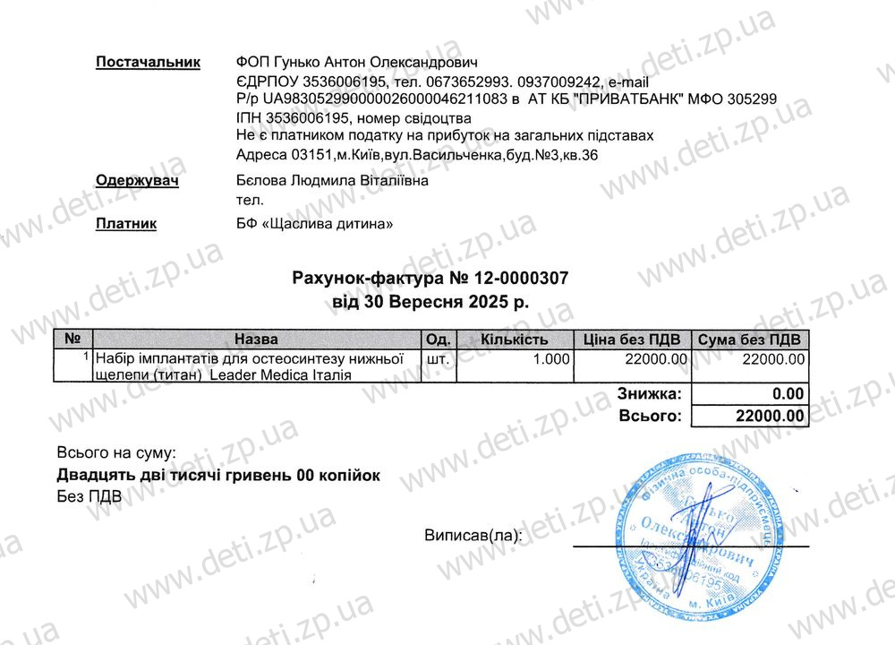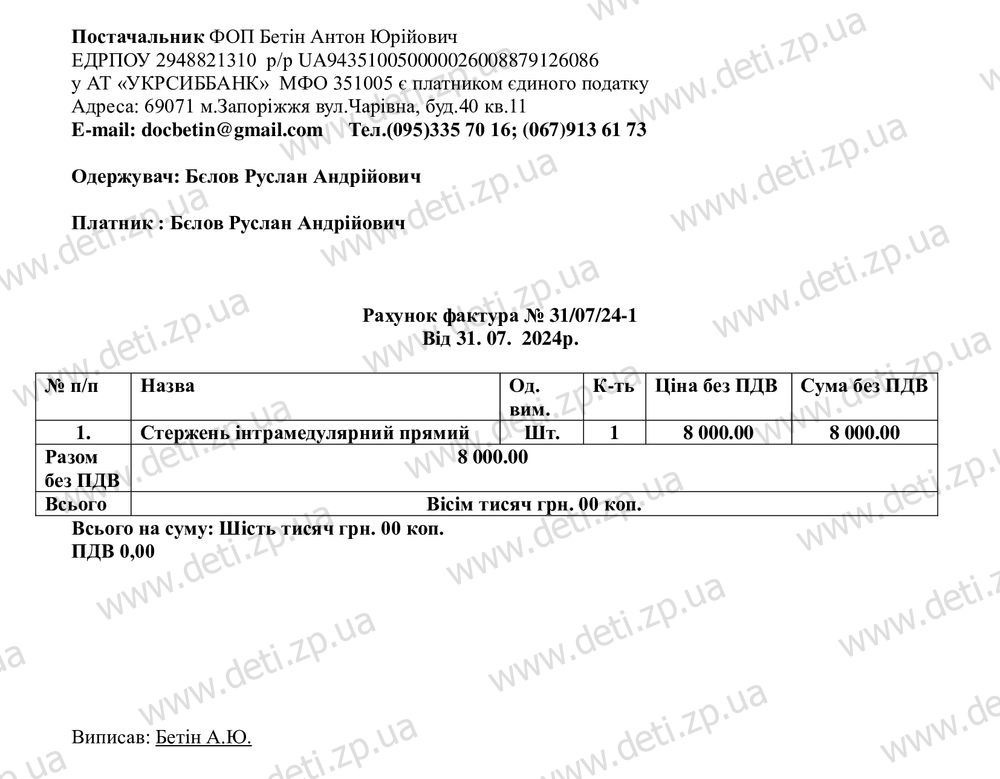 Зараз він перебуває у Запорізькій дитячій лікарні, стан тяжкий, але стабільний. Лікарі призначили термінове оперативне втручання, для якого потрібні спеціальні медичні матеріали — стержень для ноги вартістю 8 тисяч гривень та пластина для щелепи вартістю 22 тисячі гривень.