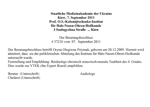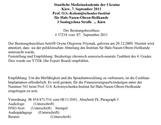 ![]() Das optimale Operationsalter beträgt 1-3 Jahre, und da Oryna 1 Jahr 10 Monate alt ist, möchten wir keine Zeit verlieren. Momentan nimmt sie an einer Voroperationsrehabilitation im O.S.-Kolomijtschenko-Institut für Hals-Nasen-Ohren-Heilkunde (Kiew) teil. Aber die Kosten fuer Implantat und Operation sind fur unsere Familie zu hoch. Das Implantat Sonata Ti 100 und der Sprachprozessor Opus 2 (hergestellt von MEDEL in Österreich), die fuer unsere Tochter vorgesehen sind, kosten in der Ukraine 258.680 Grn,. d.h. ungefähr 23.000 Euro oder 32.000 US Dollar. Die Dokumente, mit denen die Notwendigkeit der Operation attestiert wird, haben wir zu Ihrer Einsichtnahme beigefügt.