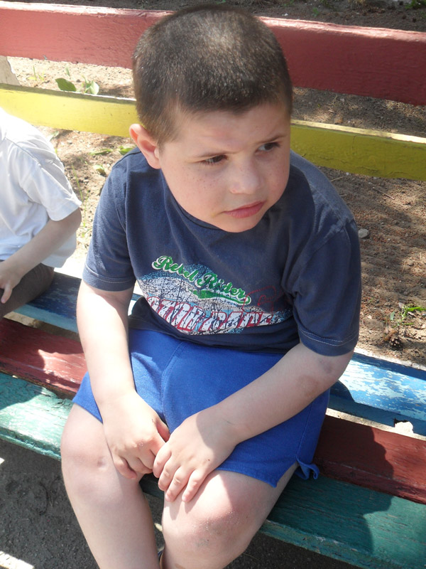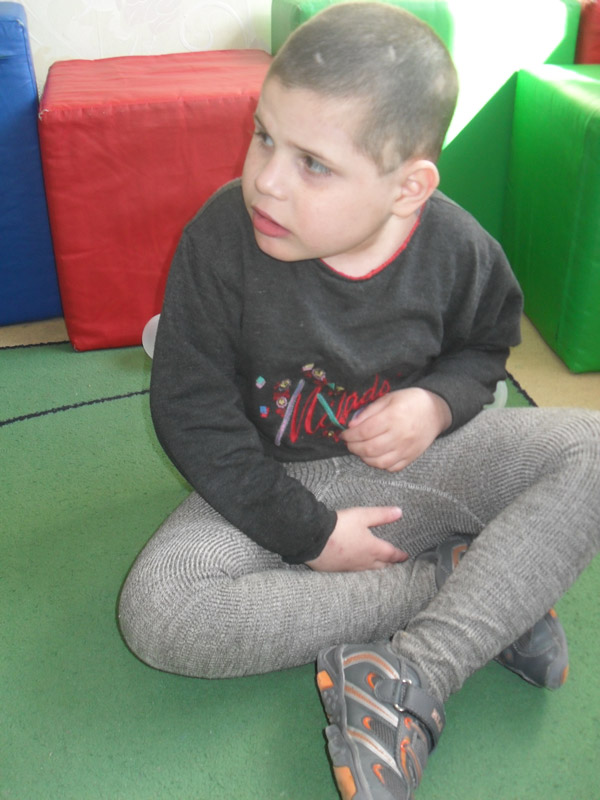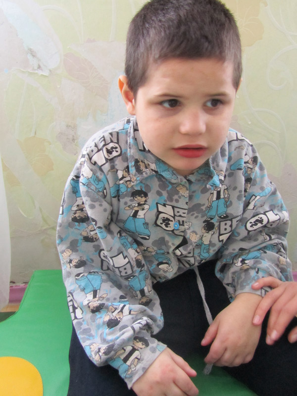 Zhenya (Yevgeniy) ist ein Junge, der auf eine Art sehr schlaff ist. Er möchte die ganze Zeit auf anderen Kindern sitzen. Sinnlich gesehen ist er sehr zärtlich und braucht wirklich die Berührung. Wenn er diese wegen seiner Eigenheit nicht bekommt, kuschelt er sich in andere Kinder. Wirklich nützen würden ihm sensorische Sachen wie gewichtete Bettdecken und Westen, um ihn zu beruhigen. Sogar regelmäßige Massagen oder "gemeinsame Kompresse" könnten helfen.