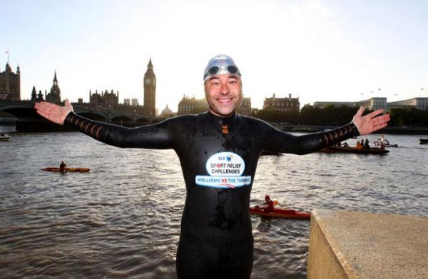 Not since a disorientated juvenile northern bottlenose whale took a wrong turn and ended up in the city in 2006 has an object afloat in the murky Thames attracted quite so much attention as the sight of Walliams's capped head and muscular forearms powering his way to the finish line. "Come on David," yelled supporters, their admiration in no small way enhanced by Walliams's determination to continue despite unappealing news on day two that torrential rain had forced Thames Water to dump 500,000 cubic metres of sewage into the very waters he would be swimming through. "We're not public health experts, but I wouldn't recommend swimming in it," said Thames Water's Richard Aylard, shortly after Walliams had been informed of this unexpected development.