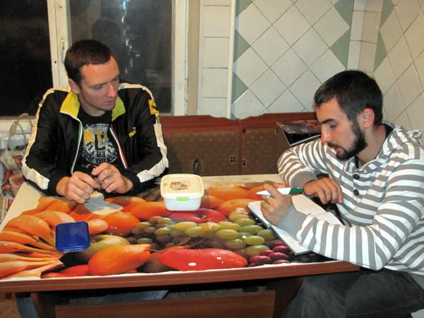 ...Volunteers Dima Buryak and Anton Bondarenko are discussing the next children’s charity project...