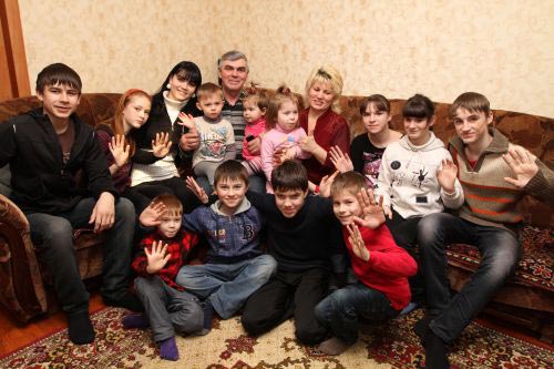 Now their daughter is 18 years old – these days she’s the eldest child still living with the parents. Kolya is the youngest – he’s just 7, and a first-grader. Sixteen children are grown up now and have their own families. They already made their Mum and Dad grandparents 14 times. Another more children just live separately.