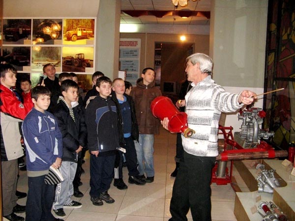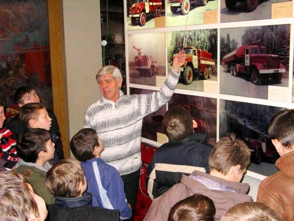 The children's introduction into the profession of a firefighter was coming to its end. And the final stage of our training tour was visiting the Main Department of the Ministry of Civil Defense in the Zaporozhye region and its exhibition of the firefighting and rescue unit. The employee of the unit, and in past – a colonel of the firefighting department in the Zaporozhye region who participated in combating the fire at Chernobyl Nuclear Power Station, Anatoliy Romanchenko, told the children stories of the exhibits they could see in the room. Besides, he gave them a lecture about the safety rules and demonstrated special videos telling how and why the fire breaks out, how one should act in case of a fire and what the sequence of actions should be.