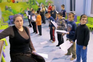 Tikva Children's Home infants' facility director Chava Melamed leads the orphanage's boys' music class. (Alex Weisler)