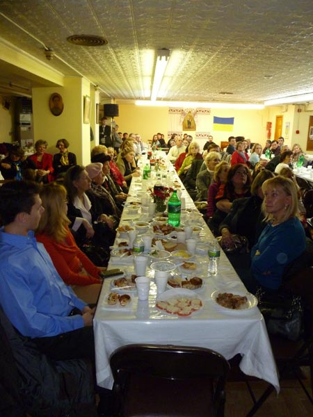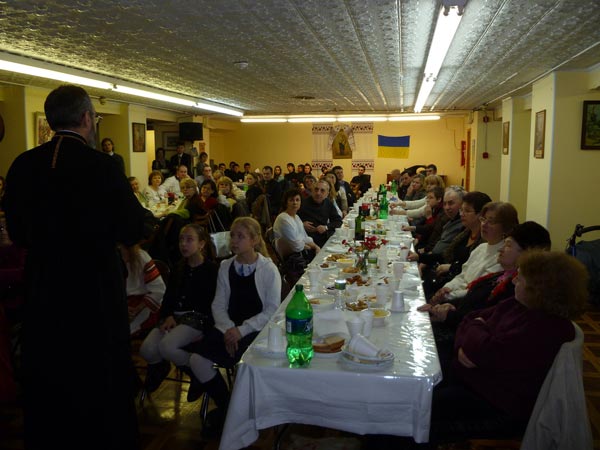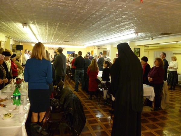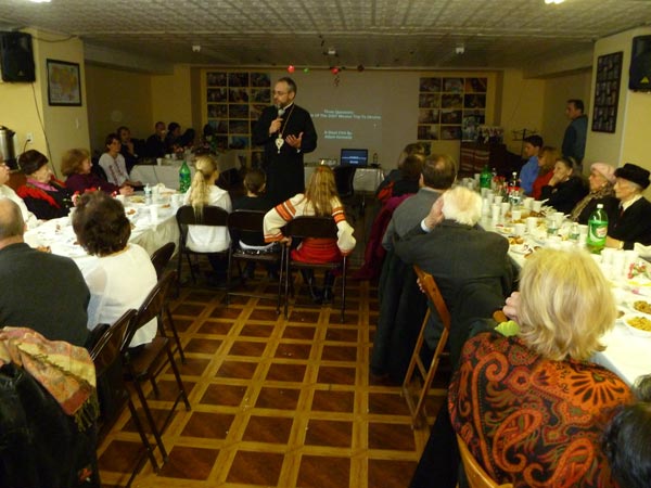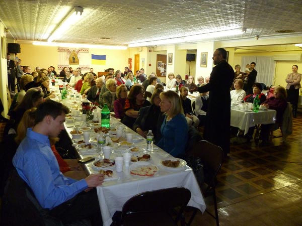 Following the Divine Liturgy, the pastor of the parish family – Very Rev. Fr. Todor Mazur along with his parishioners welcomed guests and visitors to the parish community to their social hall, where a home prepared luncheon took place. Namely there, during the Agape meal in the social hall, the bishop shared a Power Point presentation and a slide show about the Church’s work-ministry with the children of Ukrainian orphanages. Prior to his remarks, the bishop welcomed to the community several past Mission Team members that were in attendance: Katia Kosiv of Holy trinity Cathedral in New York City, NY; Olga Coffee of St. Andrew Ukrainian Orthodox Cathedral in Silver Spring, MD; Subdeacons Vasyl Pasakas and Vasyl Dovgan of St. Sophia Ukrainian Orthodox Theological Seminary in South bound Brook, NJ, as well as Zoryanna Bruher, a volunteer of Children of Chornobyl and Relief Development Fund, who joined the parish congregation for the presentation from Ukraine.
