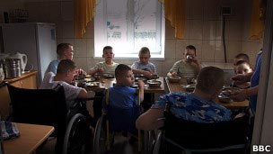 In this home we met 10-year-old Lyosha. He has no arms or legs, but he has fighting spirit and ingenuity to spare: he can move and even go up and down the stairs by using his powerful neck muscles.