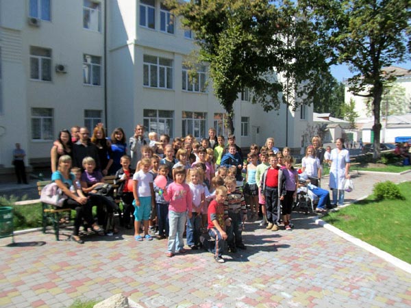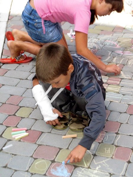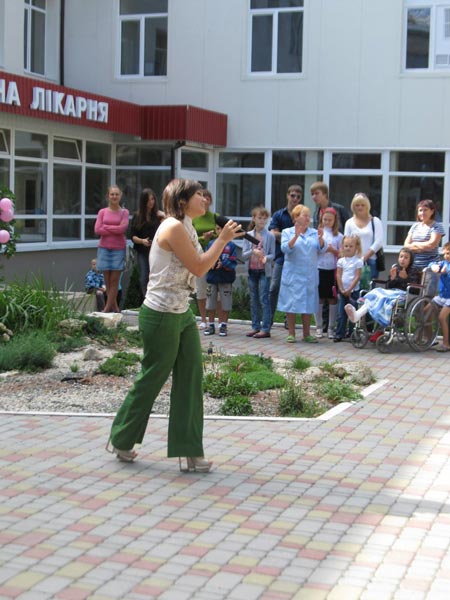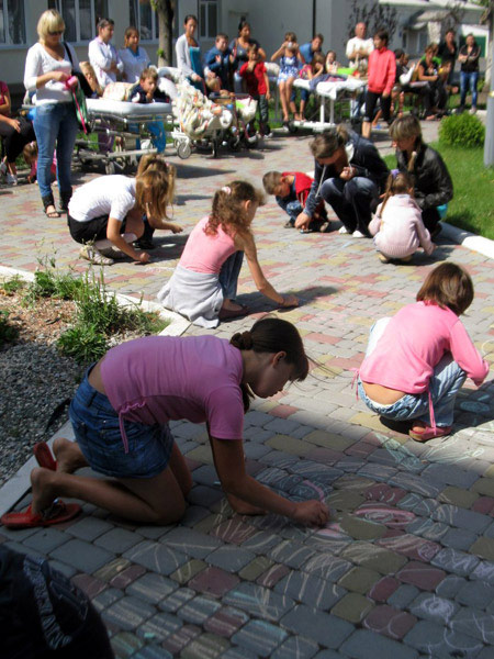 That day was not an ordinary one for the hospital. Children were laughing, smiling and having fun – not a common thing for the hospital, unfortunately. I had a feeling that the very hospital walls were absorbing the positive emotions as it was something they really lacked. As many children as possible were brought to the party: those who couldn’t walk were in wheelchairs or on wheelbarrows. We tried to involve everybody to have no child bored or without attention. There were verses, songs and contests, chalk drawing on the pavement and prizes to the most active participants. We remembered about the teachers as well as they work hard for the well-being of sick children.