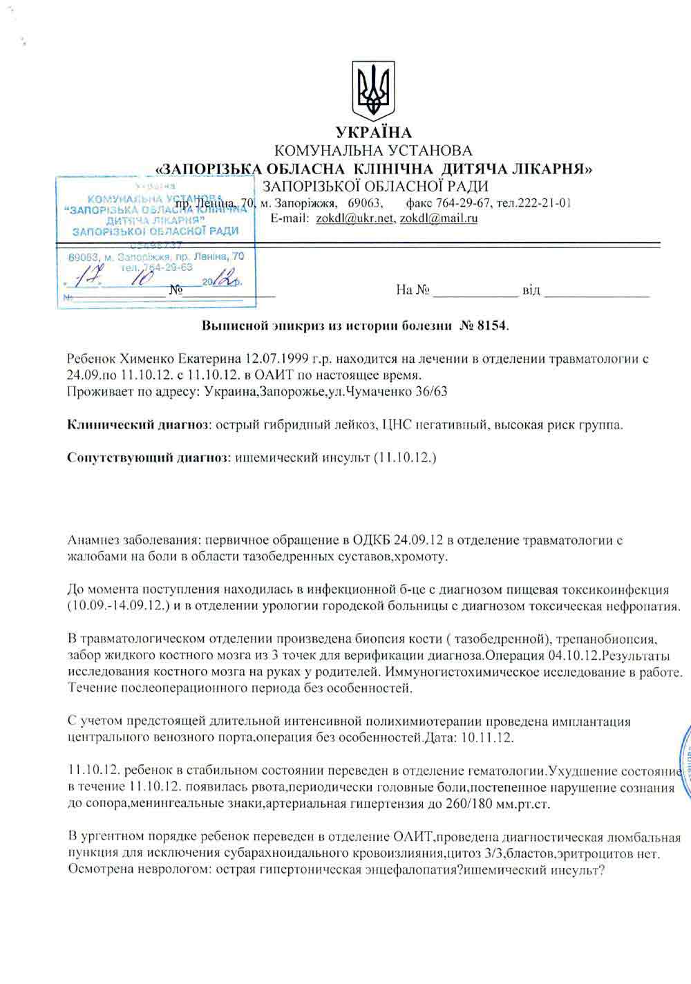 Diagnosis: hybrid acute leukemia, CNS negative, high risk group, ischemic stroke (11.10.12).
