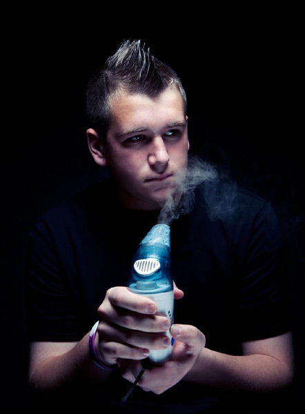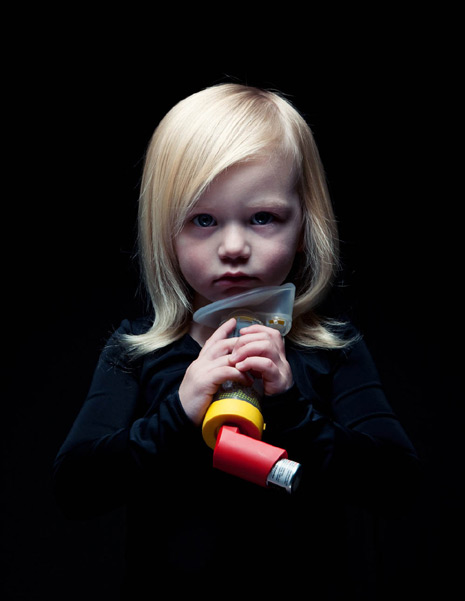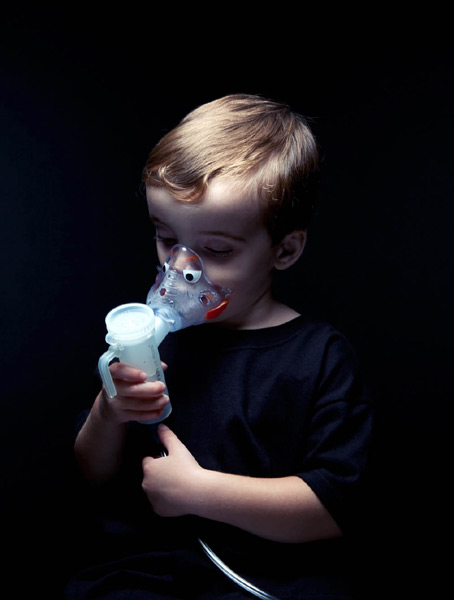This memorable photograph was taken of four year old Michael Lawrence, a young child affected with Cystic Fibrosis. In the image Mikey holds his fish nebulizer Bubbles and takes a breath to help his lungs breathe through the thick mucus his body forever produces. In an attempt to making breathing treatments more appealing and less threatening for the kids, there are a variety of pediatric masks – dinosaur, elephant, etc for the different nebulizers.