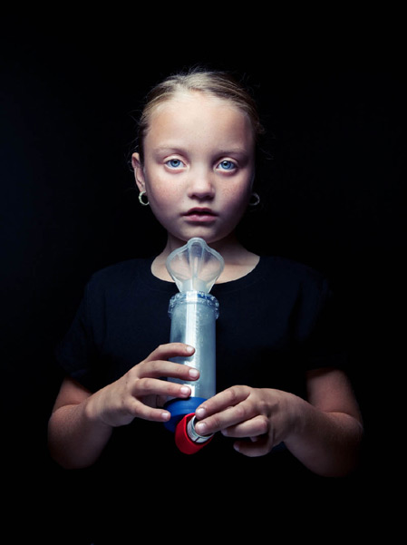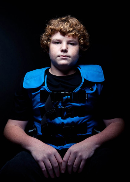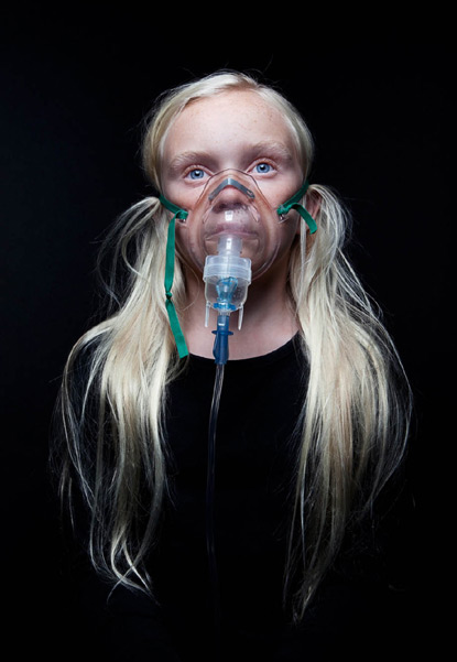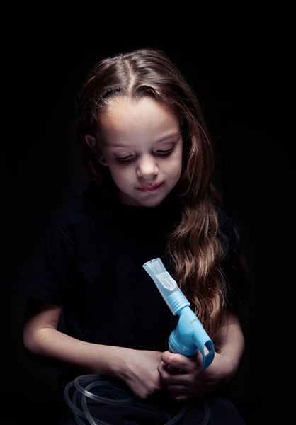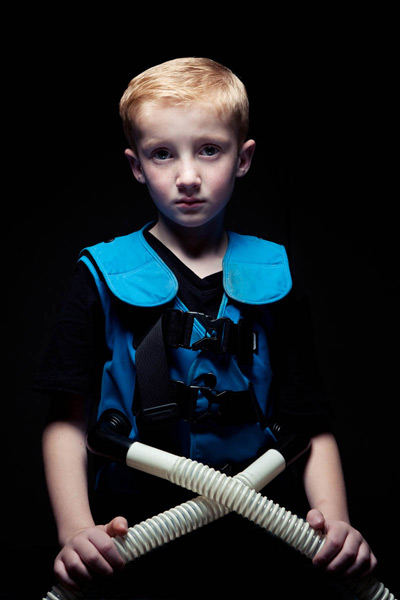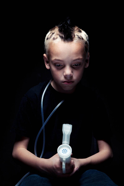 Moments after reviewing the image I instantly knew I created something powerful, beautiful and moving. This particular photograph of Michael Lawrence would steer the direction of the shoot. Initially I planned to photograph each subject three different ways. First a close up portrait of each face, next a full body frame incorporating a personal item and finally a portrait with the medical equipment. After photographing Mikey with his nebulizer I made it a point to focus my time and effort photographing the children with their medical devices which consisted of nebulizers, high-frequency chest oscillation vests, inhaled bronchodilators and antibiotics.