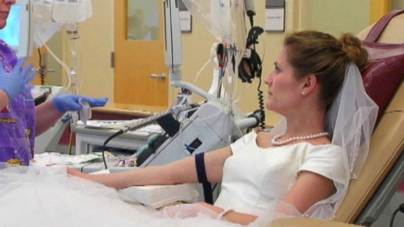 Monica Behney donates blood on her wedding day at the Virginia Blood Services Donor Center in Richmond, Virginia on June 1, 2014. WRIC