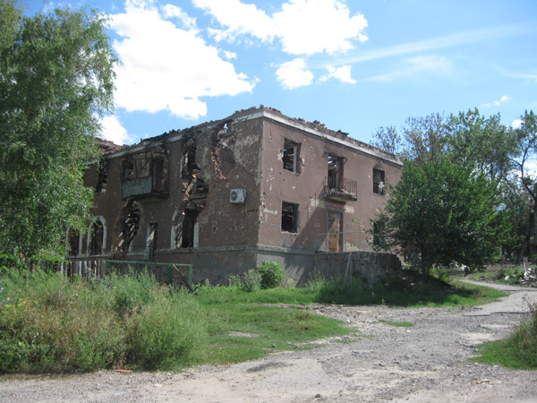 Then our travels proceeded through the cities of Krasnoarmeisk and Kramatorsk into Slavyansk. Kramatorsk didn't seem to have sustained any damage from the fighting. Only in one of the buildings we saw severe damage on the 9th floor. That building was actively being repaired, with the construction crane in action.
