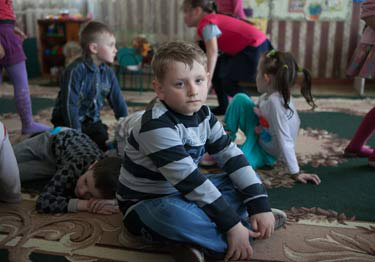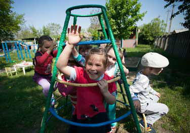 A the only operating kindergarten in Debaltseve, Ukraine, the playground is bustling with children.