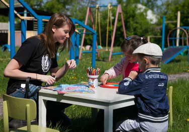 In March, a mobile team of volunteer psychologists arrived on site to work with the children, one of three such teams operating with UNICEF support in non-government-controlled areas of eastern Ukraine. The teams had recently been set up as part of a programme developed by UNICEF Ukraine child protection specialist Gabrielle Akimova and Director of the Donetsk Republic Educational and Methodological Centre for Psychological Services Inna Ivanova.