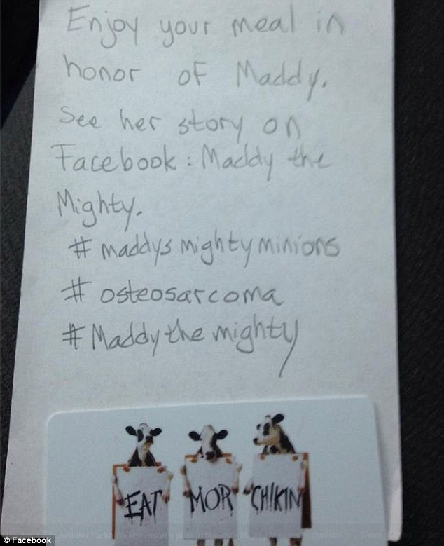'I paid for the car behind me in the drive thru this morning. Your spirit is in the Houston, TX area, Maddy, as we spread your kindness. My daughter is the same age as you and also fought osteosarcoma. May your family be comforted,' wrote Jennifer E.