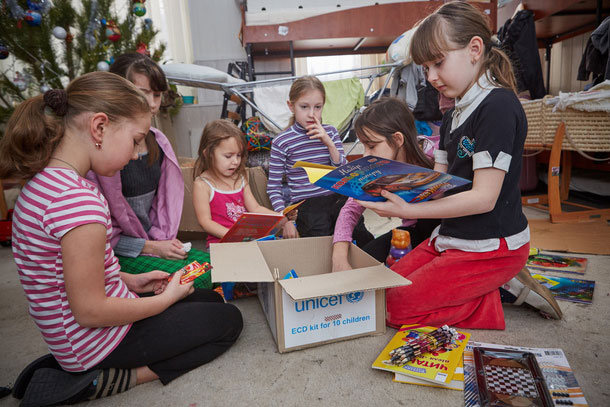 Internally displaced children from Lugansk enjoy their new individual education kits provided by UNICEF in partnership with organizations Rubezhi/ Stantsia Kharkov. Copyright: UNICEF Ukraine/2015/A.Krepkih