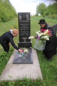 Holocaust survivor Rita Schweibes places flowers on a memorial to child Holocaust victims in Tulchyn, Ukraine, May 10, 2017. Mass burial graves can be seen behind. (Sue Surkes)