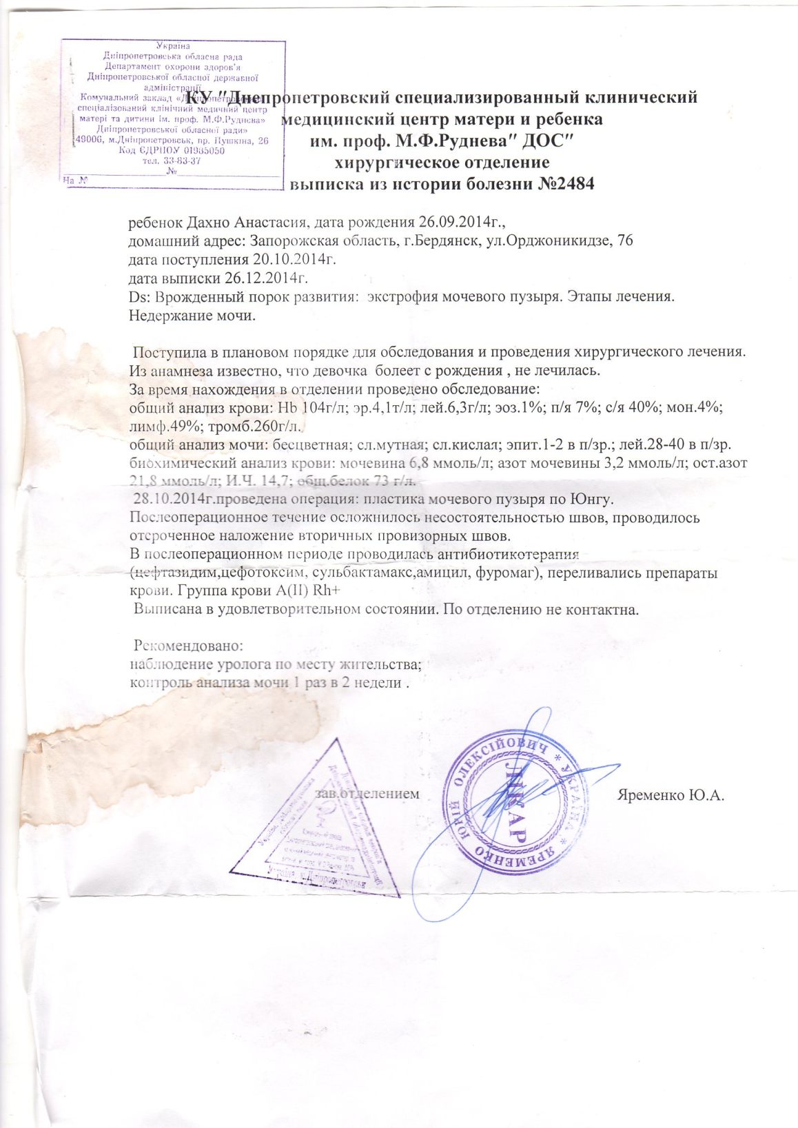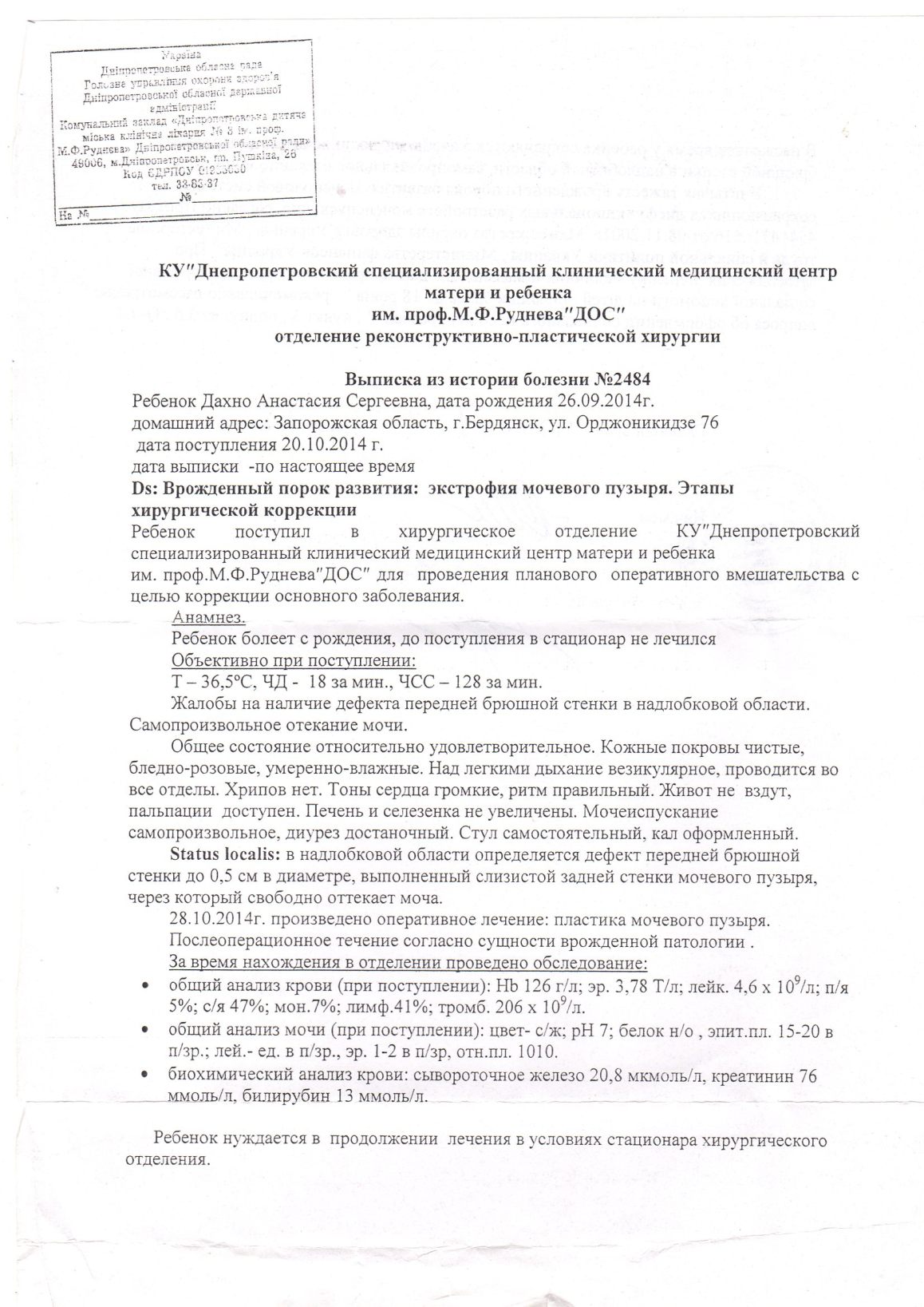Nastenka (Anastasia) was brought into this world on 26 September 2014. Nastenka was the second child born into the Dahno family. At birth she was given a terrifying diagnosis - bladder exstrophy. This is a very serious malformation of her urology system in which the front wall of her bladder is missing.