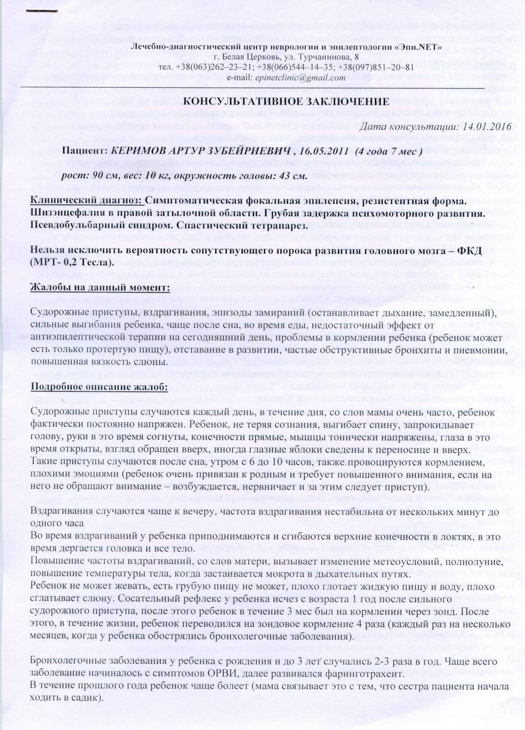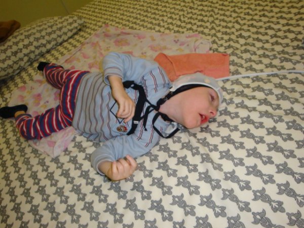 One more winter has passed in the life of our little hero Arthur Kerimovа, and we can say that he has coped with all the things which were planned for this period. In late December, Arthur went through integrated diagnostics in Kharkov Specialized Medical and Genetic Center. The diagnostic results showed that the boy has got no serious genetic issues. It means that there are chances for his development. Yes, there is metabolic disorder, which is to be treated, there are elevated levels of homocysteine and there is dysbacteriosis caused by the regular use of a number of medical drugs. But all those conditions are controllable and treatable. The boy has already received two treatment courses prescribed by the Kharkov Center, now he started the third course and then he will have the fourth course, followed by control tests. But we can already say that there is a certain result – the boy’s immune system has strengthened, which allowed him to avoid winter viral infections. Unfortunately, there is a total “catastrophe” with dystonic attacks or storms. It is heartbreaking to watch the kid suffering but so far nothing helps to stop the attacks. So in January the family went to Bila Tserkva for night video monitoring to make corrections of the anticonvulsant therapy and define further steps. Arthur bravely spent 10 hours without his Mommy’s arms with electrodes connected to his head which were recording the attacks.