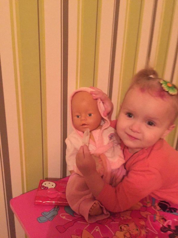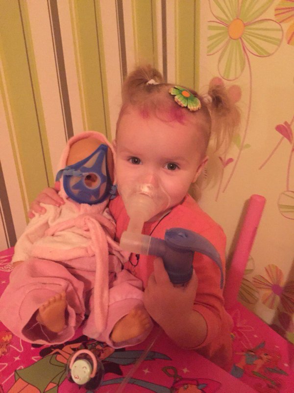 Inhalations are something special with this little girl. Pelasha does not like breathing through a nebulizer on her own. So she sits her favorite doll next to her and puts in a mask on her, looking carefully for it to stay firmly against the doll’s face. Pelasha’s toy friend also has to go through injections and take all the drugs as the girl shares all her experiences with the dolly.