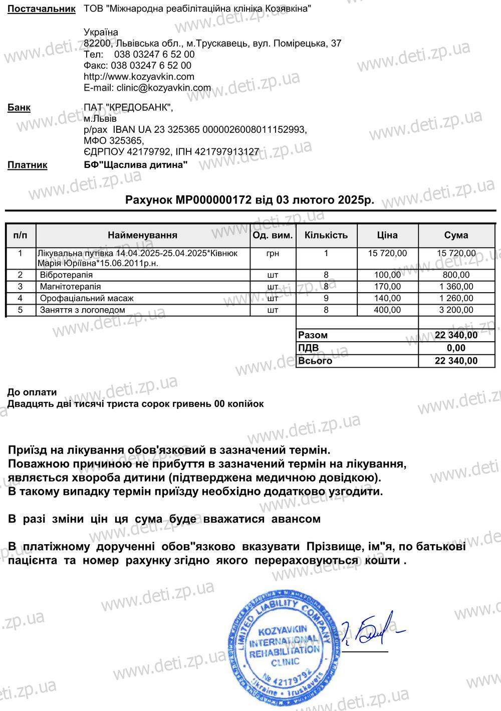 To reduce spasticity and pain, Mariyka needs several rehabilitation courses per year. We aim to raise funds for one of these courses at the Kozyavkin Clinic, which costs 22,340 UAH (approximately 540 USD). In relatively peaceful Truskavets, she will have the opportunity to recover not only physically but also emotionally.