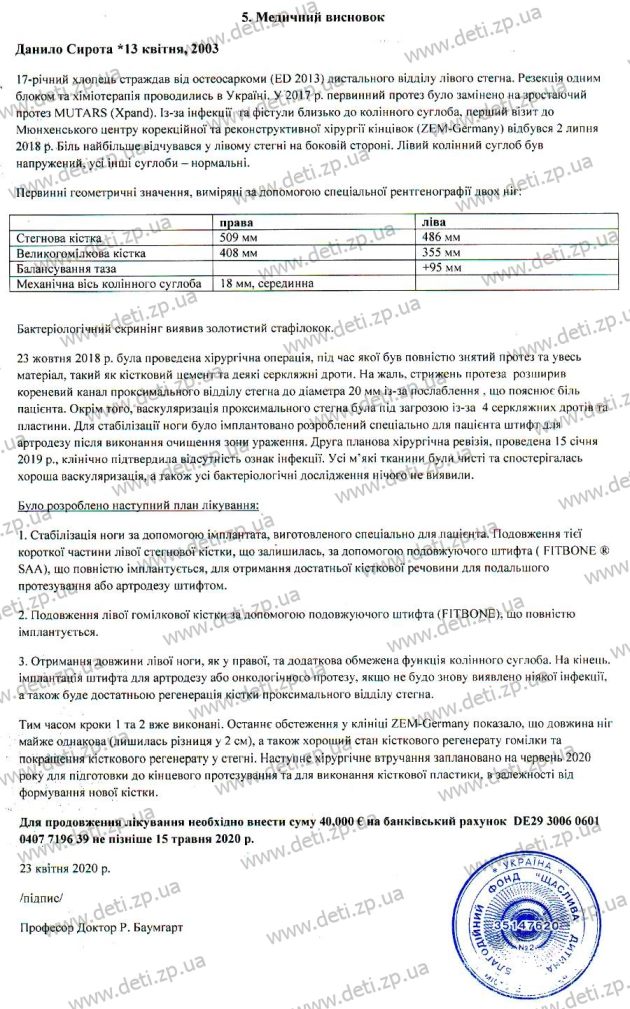 В сентябре 2018 года на международной платформе «Украинской биржи благотворительности» стартовал проект помощи Данилу Сироте под названием «Помогите побороть боль!». А в июне 2019 года на выполнение проекта была собрано и перечислено в Центр коррективной хирургии конечностей в Мюнхене 300 000 гривен. После всех ревизионных операций и проб профессор принял решение, что уже можно ставить удлиняющий протез. 25 июня прошла 7-часовая операция по установке сложного протеза, изготовленного специально для Данила. В результате были поставлены два модуля, рассчитанные на увеличение общей длины ноги с наращиванием кости.