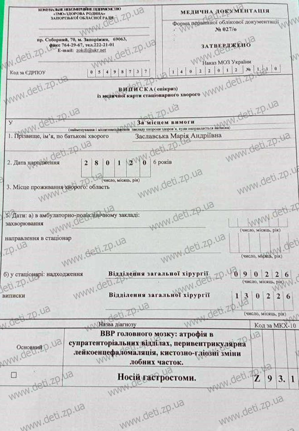 Під час народження Марійка пережила кисневе голодування. Це призвело до ураження головного мозку та важких, незворотних наслідків. Нині дівчинка має складні діагнози: спастичний тетрапарез, симптоматичну епілепсію та значну затримку розвитку.