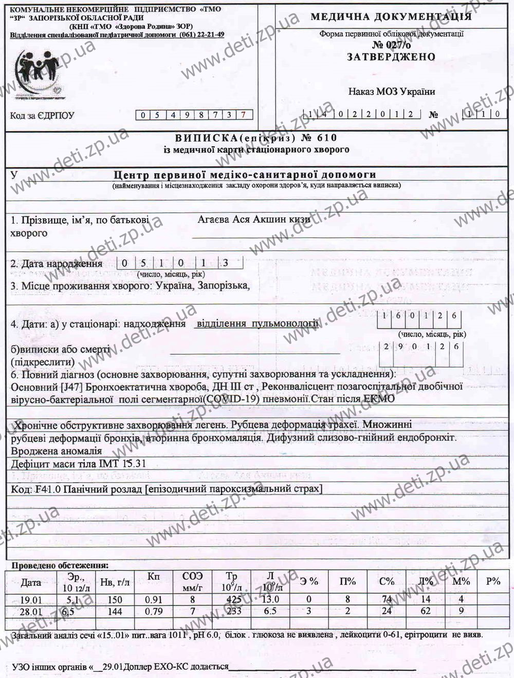 Діагноз: Бронхоектатична хвороба з дихальною недостатністю III ступеня, ХОЗЛ та рубцева деформація дихальних шляхів у стані після важкої COVID-пневмонії та ЕКМО.
